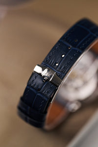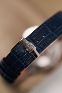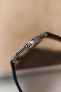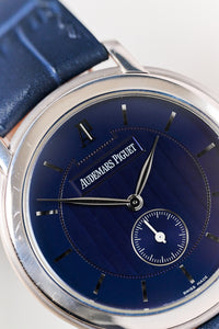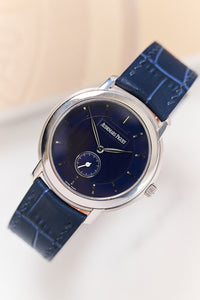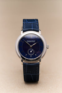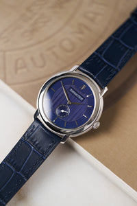 The reference 15056BC shown here is easily one of the prettiest watches we’ve had in recent months. The 36 mm 18k white-gold case measures under 8 mm thick and, thanks to its gently curved lugs, wears beautifully on the wrist. The star of the show, however, is undoubtedly the deep purplish-blue dial. The finishing is exquisite, and the simple applied markers, sub-seconds dial, and elegant leaf hands complete the refined aesthetic.