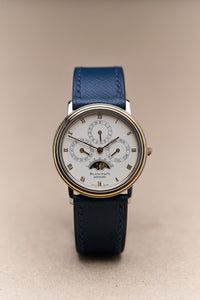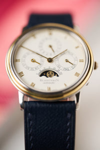 Around 1986, following the release of the 6595 Complete Calendar Moonphase and the ultra-thin 0021, Blancpain introduced their first Perpetual Calendar, the 5395. These were offered in several precious metals, steel, and bimetal configurations. This particular example is the 1318 variant, denoting a bimetal case and a white dial.