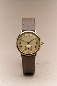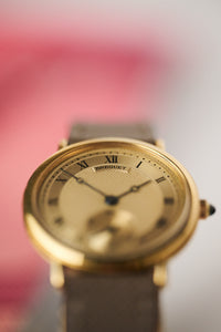 Breguet is known for its complications—and how it manages to fit so much (be it a power reserve, moonphase, date/day, etc.) onto a classically sized dial and sleek case. The present example, however, showcases the brand’s mastery on the other end of the spectrum. The time-only, gold-on-gold ref. 3090 hails from the Roth era and is anything but plain. The dial features three types of guilloché finishes, separated by Roman numeral indices and a small seconds subdial, and adorned with blued steel Breguet hands and a blue sapphire cabochon crown.