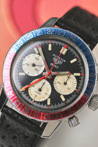 The Heuer Autavia GMT combines Heuer’s mastery of the racing chronograph with a GMT function.