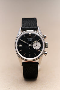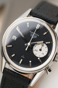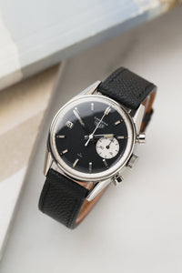The present example is the rarer black-dial version of the Dato 45, reference 3147N. It features a date window at 9 o’clock and a single white register (the minute totaliser) at 3 o’clock. The result is arguably one of the quirkiest and most distinctive designs in the Carrera lineup. It also represents the pinnacle of Jack Heuer’s minimalist, legibility-driven design ethos—so minimal, in fact, that it omits even a running seconds hand.