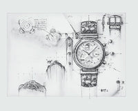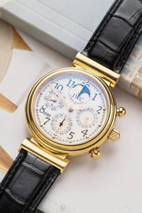 The mechanical genius of the watch is matched by its condition here. When the watch originally came to us, it had not been worn for years... as displayed proudly by the date, day, and year on the dial. It took just over an hour, and at the expense of several strained forearm muscles, to set it to the current date, all with a simple motion of turning the crown. The 41.5mm case is in perfect condition, as is the white hand decorated dial. The watch comes with all of its original boxes, paperwork, and accessories. We also added another custom strap from our friends at The Strap Tailor.