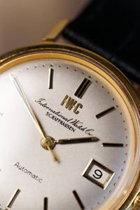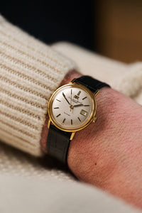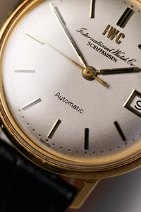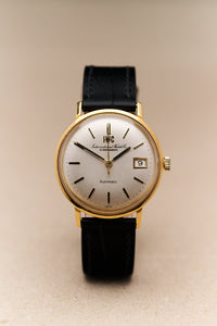 The example offered here is reference R818A, dating to 1969 and housing the Calibre 8541 movement. On the wrist, it perfectly illustrates why vintage IWCs are so beloved—the 35 mm 18k gold case wears beautifully. The case shows minimal polishing, the dial remains in excellent condition, and the tritium lume has aged to a warm, creamy hue that pairs wonderfully with the gold markers and hands. The watch is also accompanied by its original box.