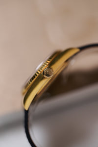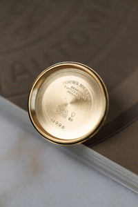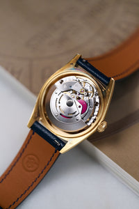 The 16000 range was the first to be equipped with a quick-set date function, thanks to its cal. 3030 upgrade. This example, the ref. 16018, features a “1” denoting the fluted bezel and an “8” signifying its solid 18K yellow-gold construction.