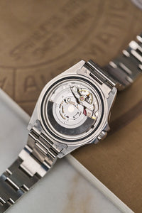 The 16550 was produced for just four years before being replaced in 1989 by the model we see here: the 16570. Over time, collectors noticed that the tritium lume on some 16570s could age to a warm, creamy tone, earning these examples the nickname Chicchi di Mais (“corn kernels”).