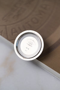 The present example features the final gilt dial, the “Type C” non-chapter ring, in the rarer “Wide Swiss” variation (the "Swiss T<25" is spread over the bottom 5 minute hashes, instead of 3.) It’s easily one of the prettiest 1675s we’ve ever had—the original markers and hands have aged to a beautiful creamy colour and glow brightly under UV light. The case remains very thick; while it has been polished previously, this was done sympathetically and in period—just look at the crown guards. The correct white date wheel with open 6s and 9s is still present. The red-back bezel insert is heavily faded to silver/copper tones, offering a striking contrast against the perfect mirror-finish gilt dial.