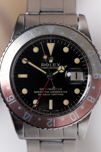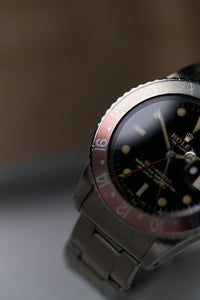 In vintage Rolex collecting, the GMT-Master 1675 is arguably one of the most interesting references (and Tommy’s personal favourite). Rolex introduced the GMT-Master line in 1954 with the reference 6542, initially created for airline pilots who needed to track more than one time zone at a time. The 6542 features a 38 mm case and a “Pepsi” Bakelite bezel—a downright gorgeous watch, though not the most practical due to the lack of crown guards and the fragility of the bezel insert.