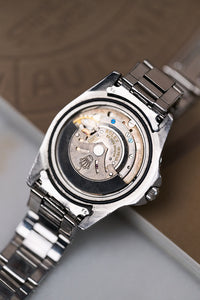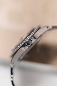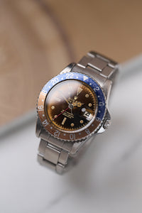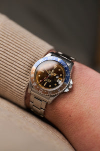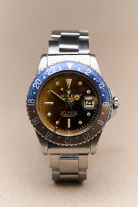 In vintage Rolex collecting, the GMT-Master 1675 is arguably one of the most interesting references (and Tommy’s personal favourite). Rolex introduced the GMT-Master line in 1954 with the reference 6542, initially created for airline pilots who needed to track more than one time zone at a time. The 6542 features a 38mm case and a “Pepsi” bakelite bezel, a downright gorgeous watch, though not the most practical due to the lack of crown guards and the fragility of the bezel insert.