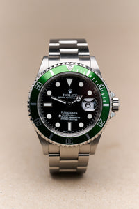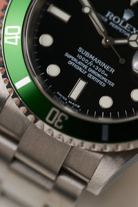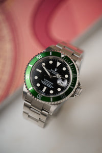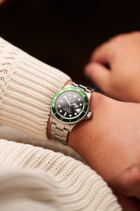 In March 2004, a gentleman walked into a Rolex AD in Northampton to purchase a new watch for himself. He received a warm welcome and was invited to try on—and choose from—anything on display or in the catalogue, something we are rather unfamiliar with nowadays. After some time, he selected a Submariner with a rather unique green bezel. The shop assistant explained that this was a brand-new model, released just a few months earlier to celebrate the 50th anniversary of the Submariner.