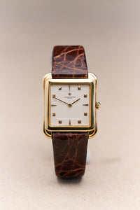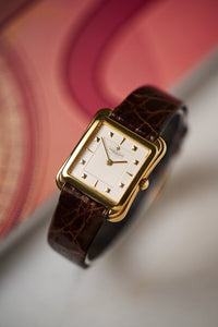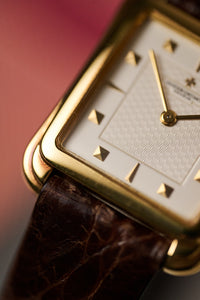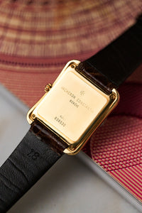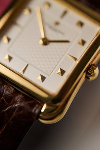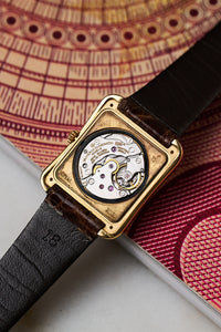 That balance is evident in references like the 31100, better known as the “Toledo.” Though rarely in the spotlight, it exemplifies the house’s blend of old-world elegance with a playful modern sensibility. The stepped, curving case—crafted from solid 18k yellow gold—narrows at the waist around the crown, creating a distinctive profile that feels both classical and contemporary.